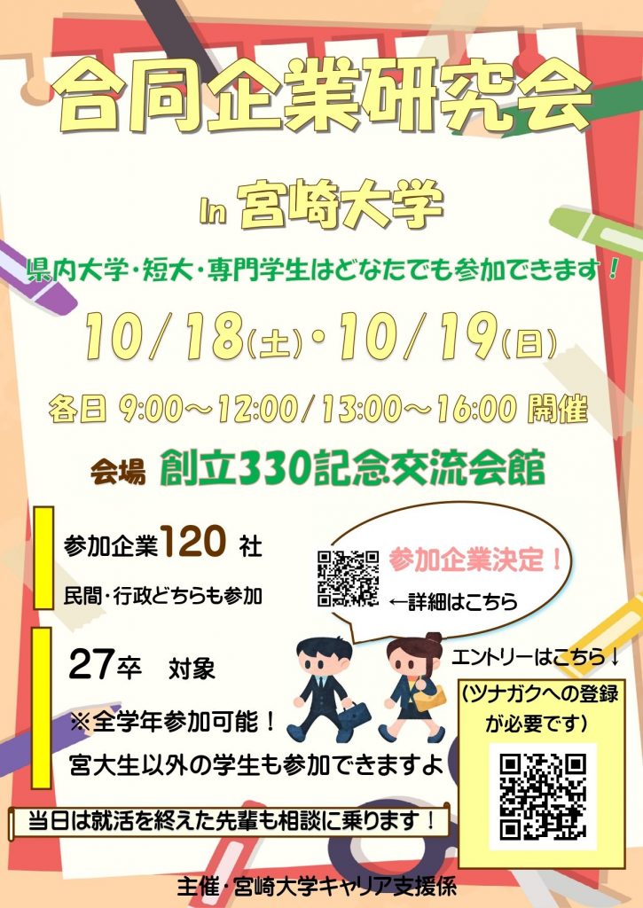 10月18・19日に宮崎大学でキャリアセンター主催の学内合同企業説明会が開催されます。