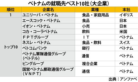 上の図はベトナムの就活生人気企業ランキング。