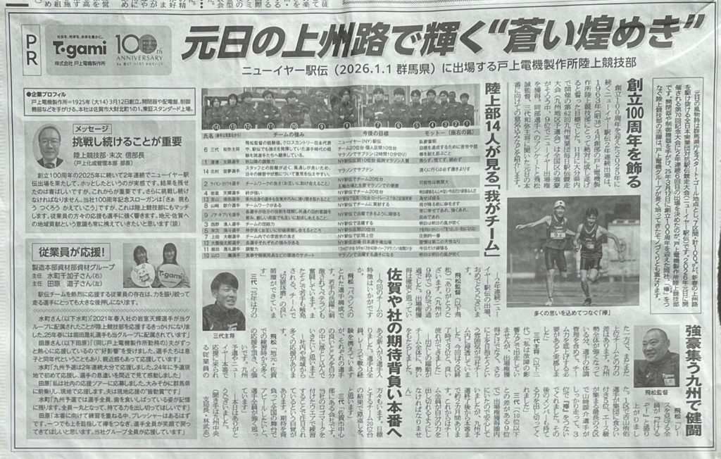佐賀県が誇る超絶優良大手ホワイト企業、戸上電機製作所が元日開催のニューイヤー駅伝に出場することを記念して記事広告を出しました。