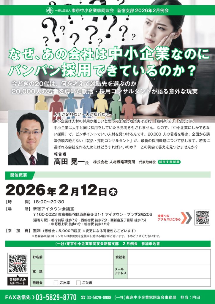 2/12東京中小企業家同友会の例会で話します! 2026年1月16日 最終更新日時 : 2026年1月16日 Koichi TAKADA 2月12日(木)の18時に西新宿に、東京中小企業家同友会新宿支部の例会にて、私が話します。 26卒新卒採用と転職市場の結果を振り返りながら、特に若年者(Z世代)の採用ができている中小企業が全国共通で行っていることを解説します。 下のURLより、ご参加くださいませ! 西新宿で僕と握手! https://tokyo-doyu.shikuminet.jp/events/7314/